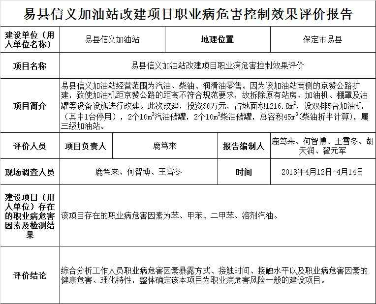 易县信义加油站改建项目职业病危害控制效果评价